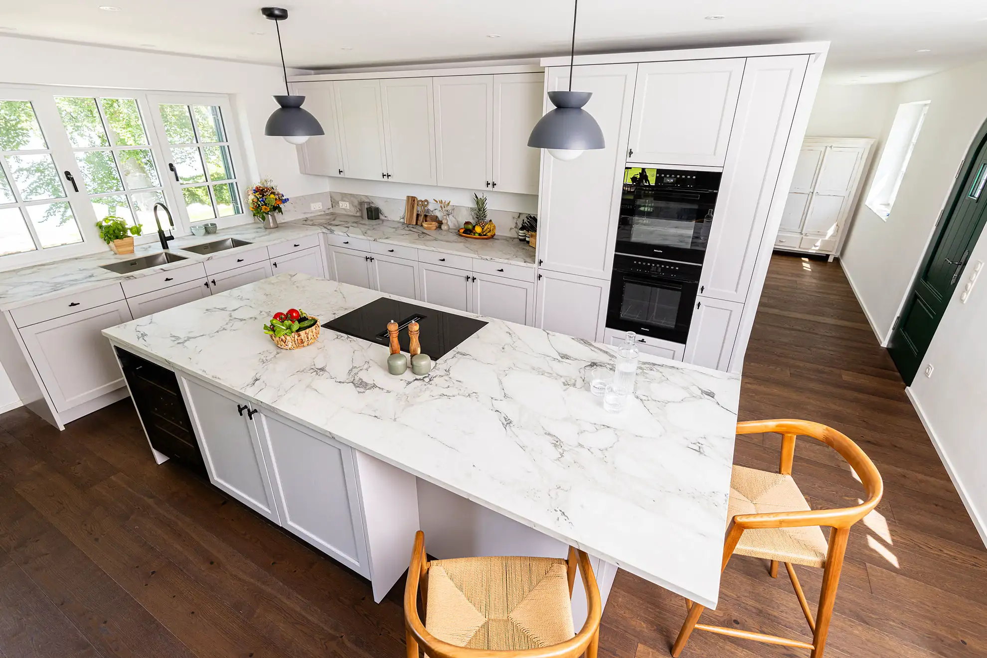 - Designfreiheit: Kücheninseln, Theken oder ein fließender Bodenbelag verbinden alle Bereiche harmonisch.